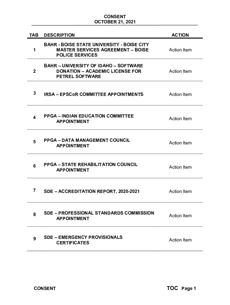 CONSENT OCTOBER 21, 2021 TABDESCRIPTIONACTION1BAHR BOISE STATE UNIVERSITY BOISE CITY MASTER SERVICES AGREEMENT BOISE POLICE SERVICESAction Item2BAHR UNIVERSITY OF IDAHO SOFTWARE DONATION ACADEMIC