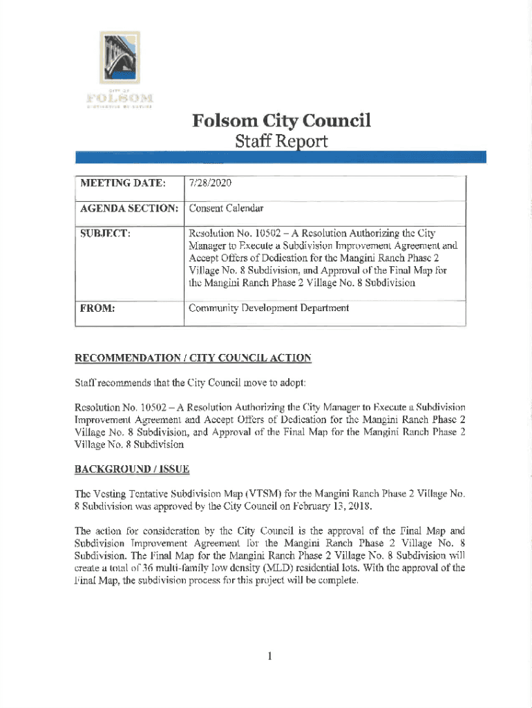 I 11.\'RL :\'[Folsom City Council Staff Re ORT MEETING DATE:712812020AGENDA SECTION:Consent CalendarSUBJECT:Resolution No. 10502 A Resolution Authorizing the City Manager to Execute a Subdivision
