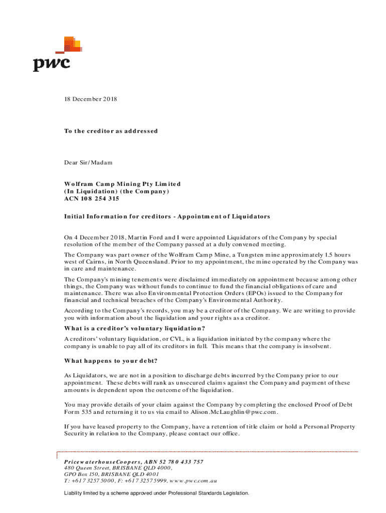 18 December 2018To the creditor as addressedDear Sir/Madam Wolfram Camp Mining Pty Limited (In Liquidation) (the Company) ACN 108 254 315 Initial Information for creditors Appointment of Liquidators