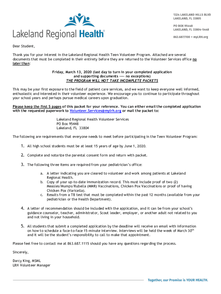 Dear Student, Thank you for your interest in the Lakeland Regional Health Teen Volunteer Program. Attached are several documents that must be completed in their entirety before they are returned to