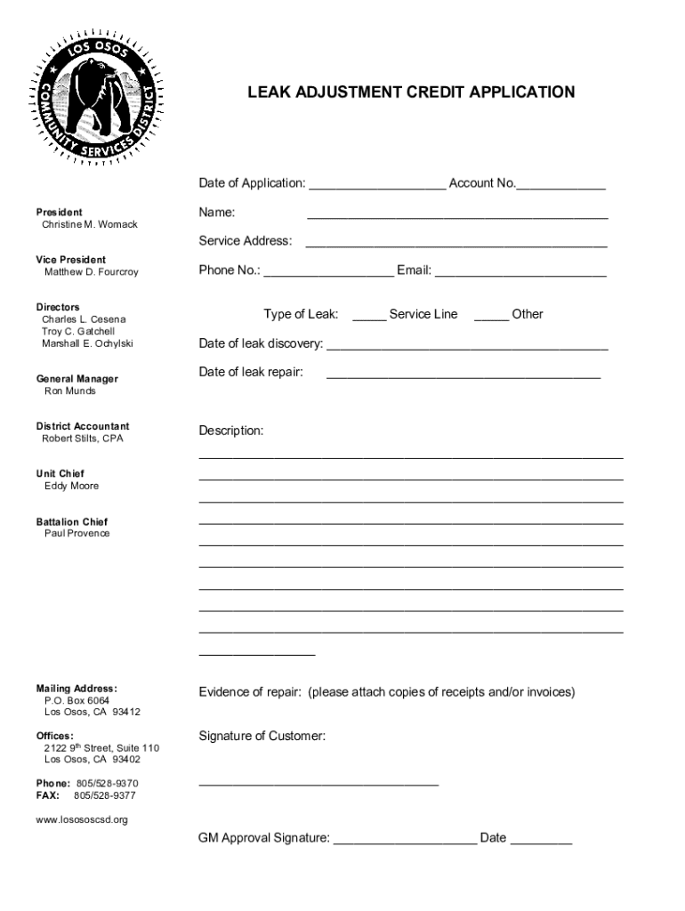 Get the free PDF LEAK ADJUSTMENT CREDIT APPLICATION - Los Osos Community ...