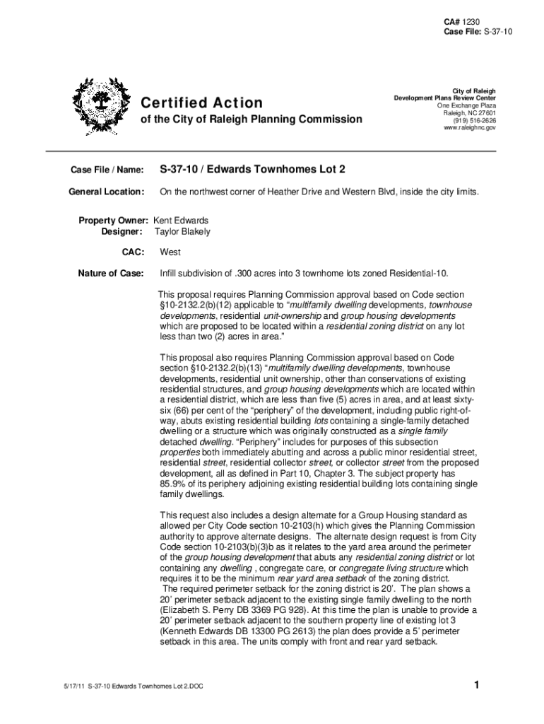CA# 1230 Case File: S3710Certified Action of the City of Raleigh Planning Commissioning of Raleigh Development Plans Review Center One Exchange Plaza Raleigh, NC 27601 (919) 5162626 www.raleighnc.govCase
