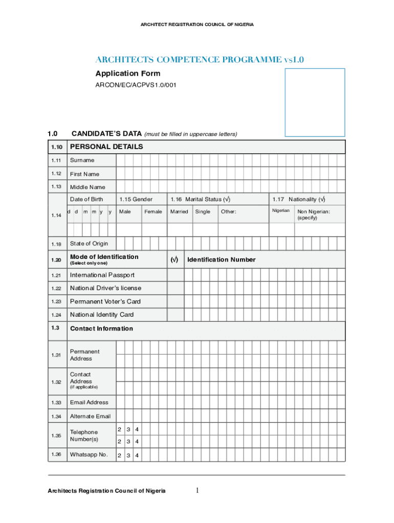 ARCHITECT REGISTRATION COUNCIL OF NIGERIAARCHITECTS COMPETENCE Program VS1.0 Application Form ARSON/EC/ACPVS1.0/0011.0CANDIDATES DATA (must be filled in uppercase letters)1.10PERSONAL DETAILS1.11Surname1.12First