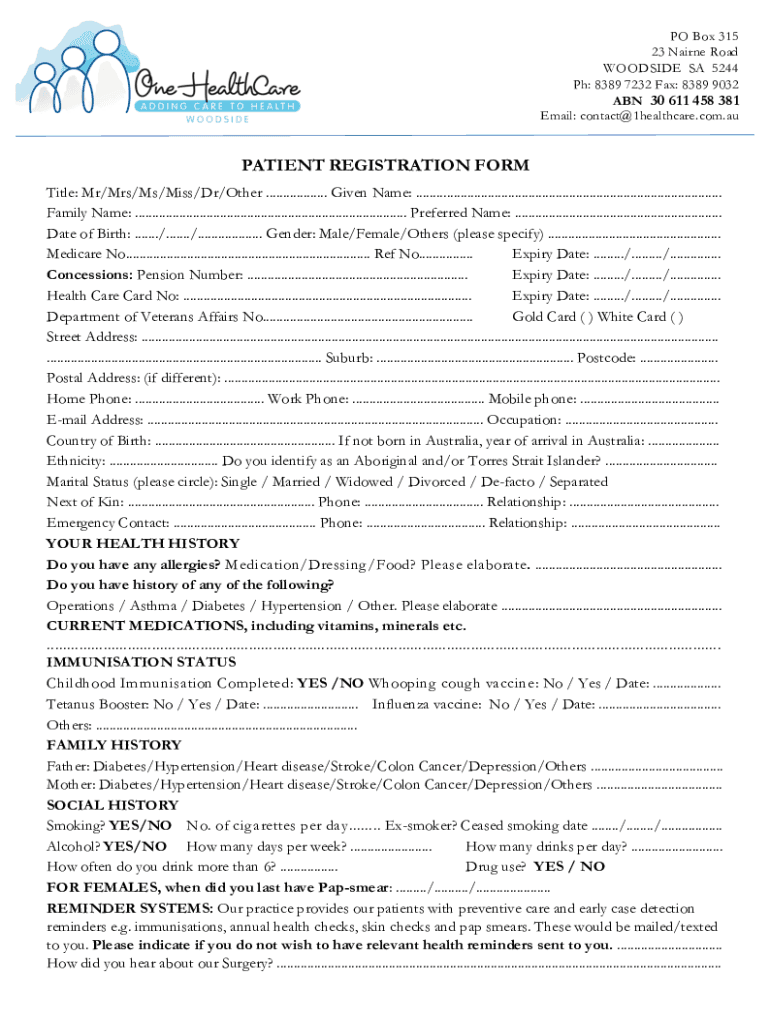 PO Box 315 23 Serene Road WOODSIDE SA 5244 pH: 8389 7232 Fax: 8389 9032 ABN 30 611 458 381 Email: contact×1healthcare.com.patient REGISTRATION FORM Title: Mr/Mrs/Ms/Miss/Dr/Other ..................