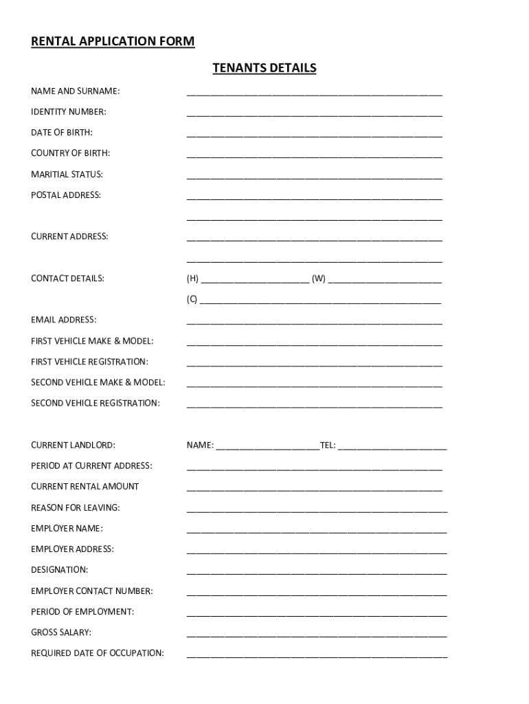 RENTAL APPLICATION FORM TENANTS DETAILS NAME AND SURNAME:___IDENTITY NUMBER:___DATE OF BIRTH:___COUNTRY OF BIRTH:___MARTIAL STATUS:___POSTAL ADDRESS:___ ___CURRENT ADDRESS:___ ___CONTACT DETAILS:(H)