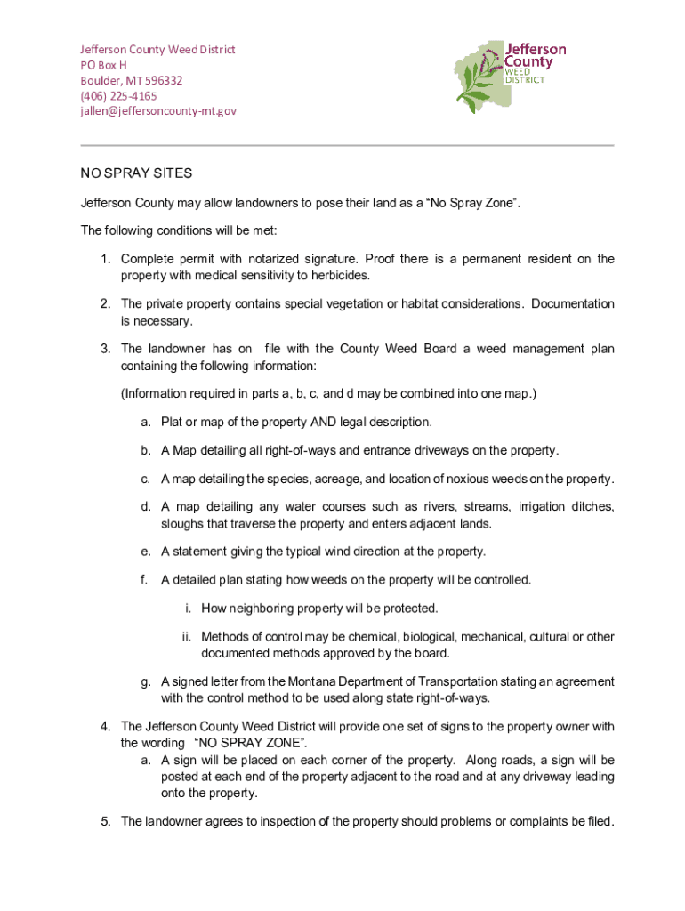 Jefferson County Weed District PO Box H Boulder, MT 596332 (406) 2254165 fallen×jeffersoncountymt.gov NO SPRAY SITES Jefferson County may allow landowners to pose their land as a No Spray Zone. The
