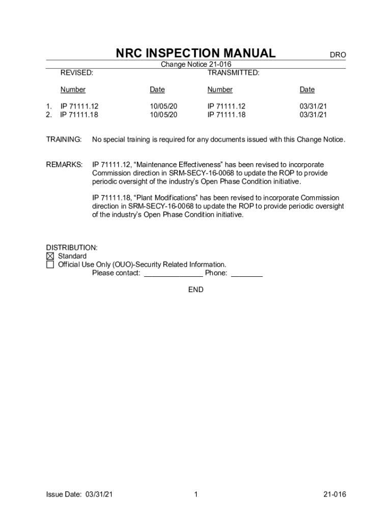NRC INSPECTION MANUAL REVISED:1. 2. Change Notice 21016 TRANSMITTED:NumberDateNumberDateIP 71111.12 IP 71111.1810/05/20 10/05/20IP 71111.12 IP 71111.1803/31/21 03/31/21TRAINING:No special training