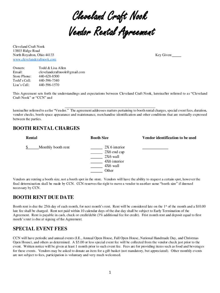Cleveland Craft Nook Vendor Rental Agreement Cleveland Craft Nook 13803 Ridge Road North Royalton, Ohio 44133 www.clevelandcraftnook.com Owners: Email: Store Phone: Todd's Cell: Lisa's Cell:Key Given:Todd