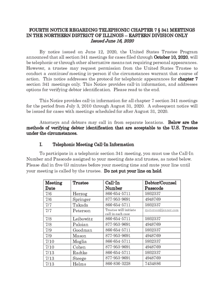 Get the free FOURTH NOTICE REGARDING TELEPHONIC CHAPTER 7 341 ...