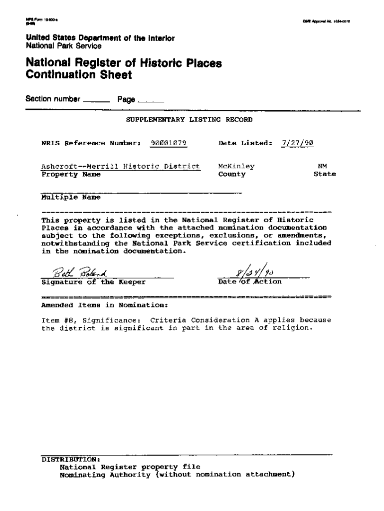 NP8 Form 10×10244018United States Department of the Interior National Park ServiceNational Register of Historic Places Continuation Sheet Section number ___ Page ___ SUPPLEMENTARY LISTING RECORD