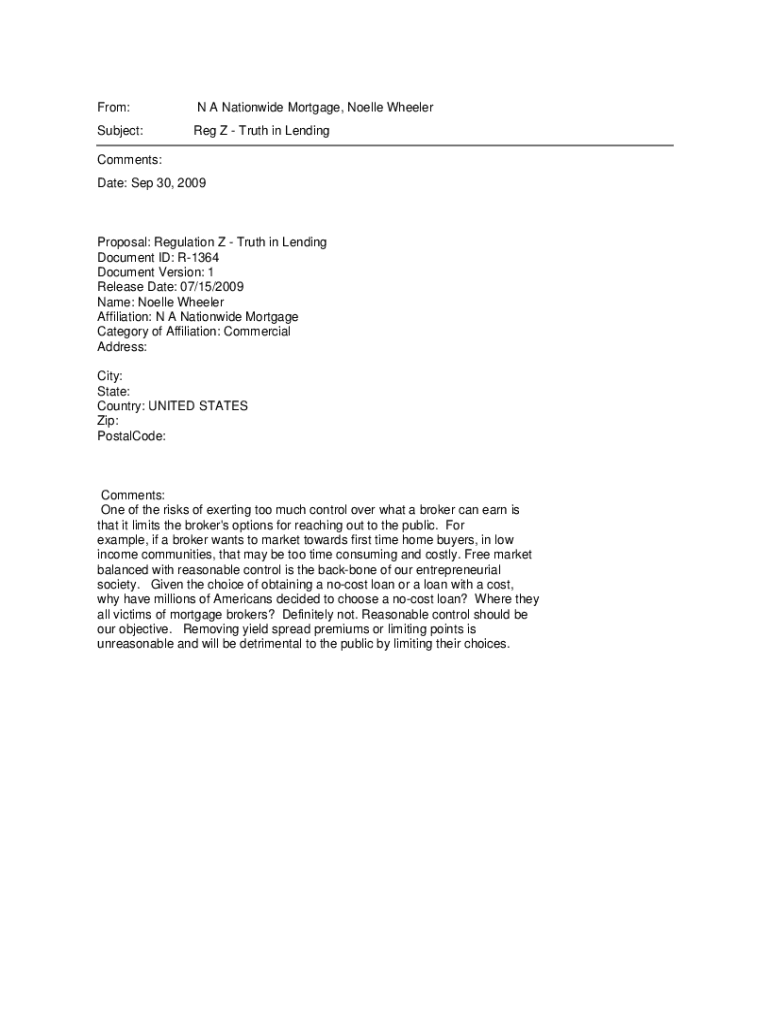 From:N A Nationwide Mortgage, Noelle WheelerSubject:Reg Z Truth in LendingComments: Date: Sep 30, 2009Proposal: Regulation Z Truth in Lending Document ID: R1364 Document Version: 1 Release Date: 07/15/2009