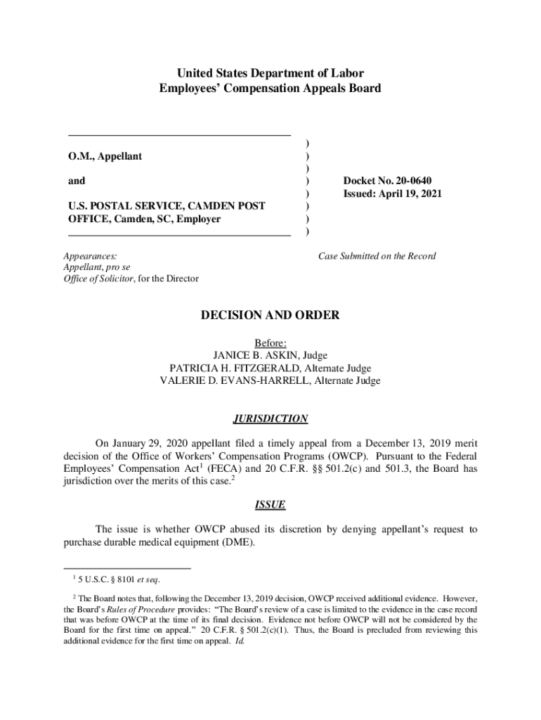 United States Department of Labor Employees Compensation Appeals Board___ O.M., Appellant and U.S. POSTAL SERVICE, CAMDEN POST OFFICE, Camden, SC, Employer ___))))))))Appearances: Appellant, pro SE