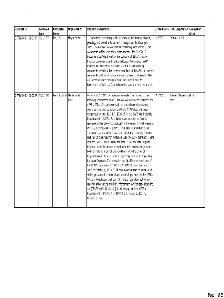 Request IDOrganizationRequest Description Mayer Brown LLP1. Documents containing statistics showing the number of open, pending, and closed enforcement investigations for fiscal year 2020. I do not