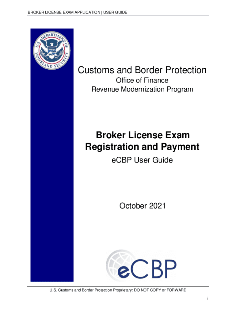 BROKER LICENSE EXAM APPLICATION | USER GUIDECustoms and Border Protection Office of Finance Revenue Modernization ProgramBroker License Exam Registration and Payment CBP User Guide October 2021U.
