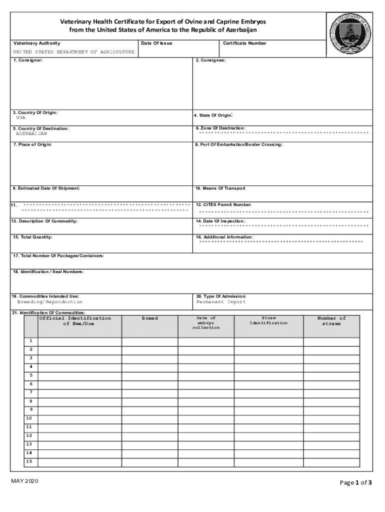 Veterinary Health Certificate for Export of Vine and Caprine Embryos from the United States of America to the Republic of Azerbaijan Veterinary AuthorityDate Of IssueCertificate NumberUNITED STATES