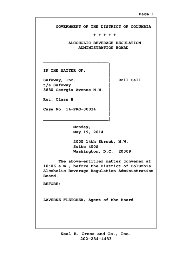 Page 1 GOVERNMENT OF THE DISTRICT OF COLUMBIA + + + + + ALCOHOLIC BEVERAGE REGULATION ADMINISTRATION BOARD ___ | | | Safeway, Inc. × t/a Safeway | 3830 Georgia Avenue N.W. | | RET. Class B | | Case
