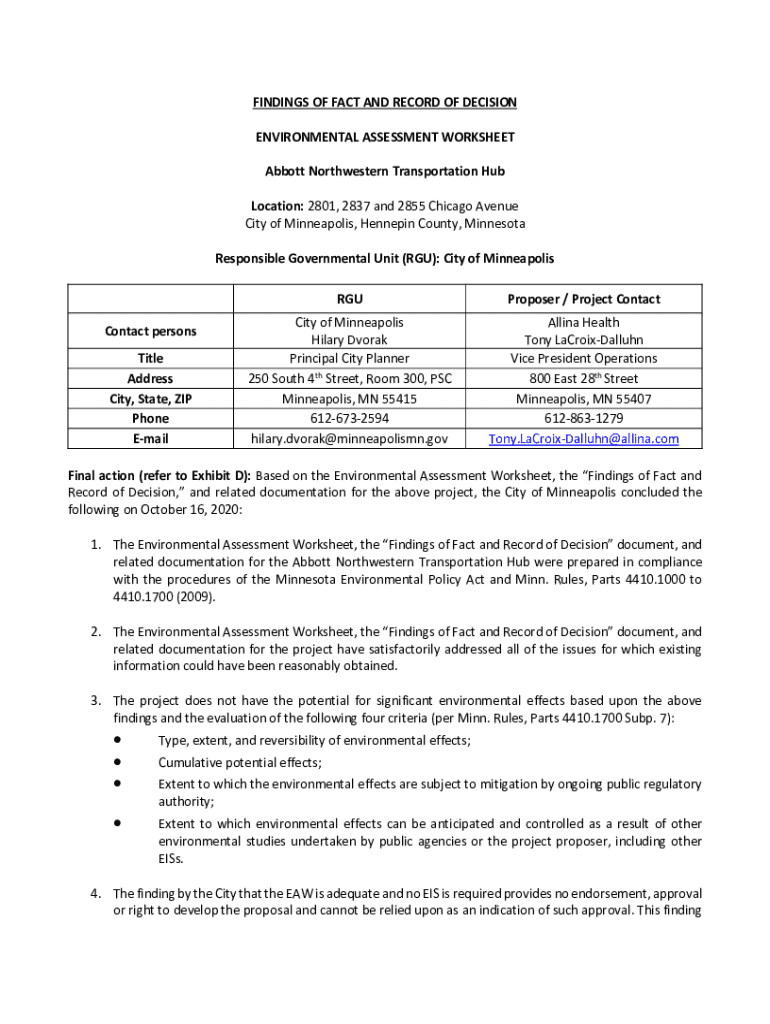 FINDINGS OF FACT AND RECORD OF DECISION ENVIRONMENTAL ASSESSMENT WORKSHEET Abbott Northwestern Transportation Hub Location: 2801, 2837 and 2855 Chicago Avenue City of Minneapolis, Hennepin County,