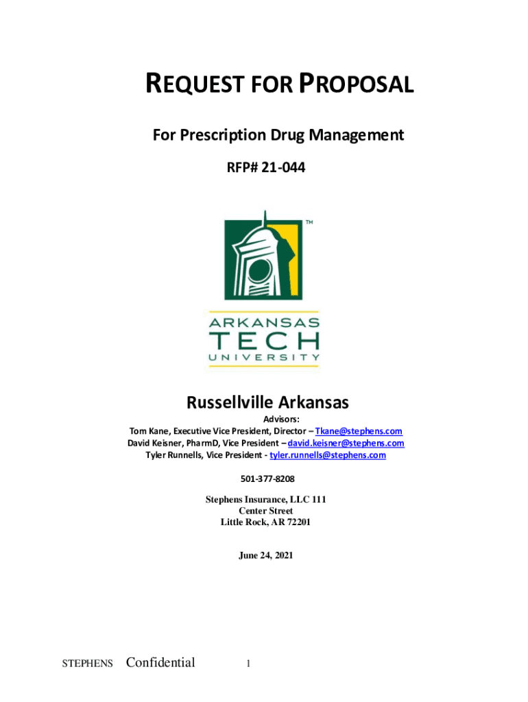 REQUEST FOR PROPOSAL For Prescription Drug Management RFP# 21044Russellville Arkansas Advisors: Tom Kane, Executive Vice President, Director Kane×stephens.com David Eisner, Pharma, Vice President