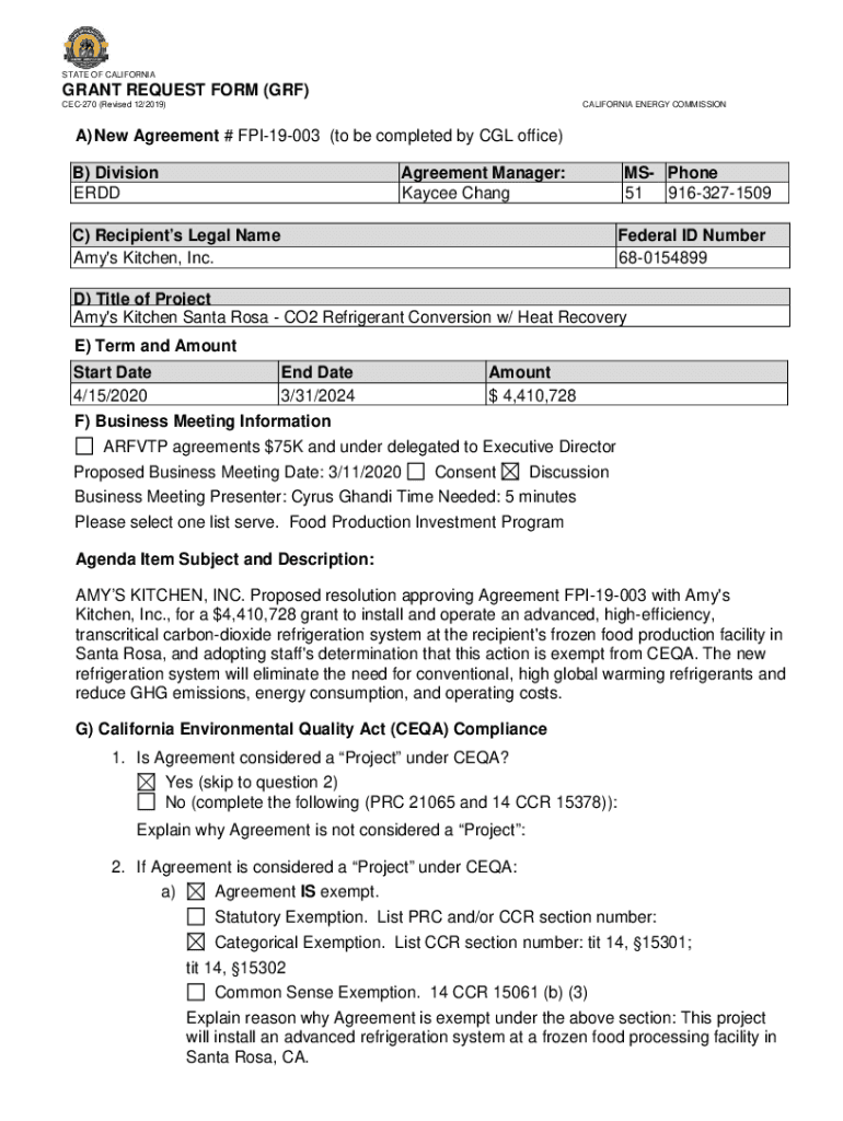 STATE OF CALIFORNIAGRANT REQUEST FORM (GRC) CEC270 (Revised 12/2019)CALIFORNIA ENERGY COMMISSION) New Agreement # FPI19003 (to be completed by CGL office) B) Division ERDDAgreement Manager: Jaycee