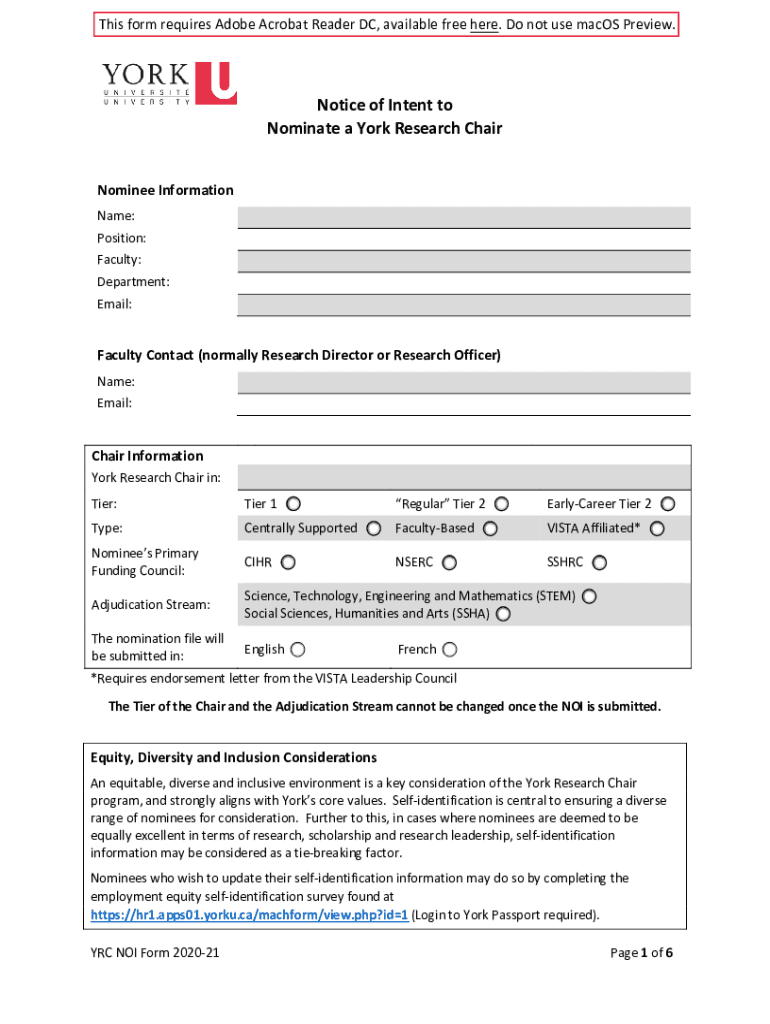 This form requires Adobe Acrobat Reader DC, available free here. Do not use macOS Preview. Notice of Intent to Nominate a York Research Chair Nominee Information Name: Position: Faculty: Department:
