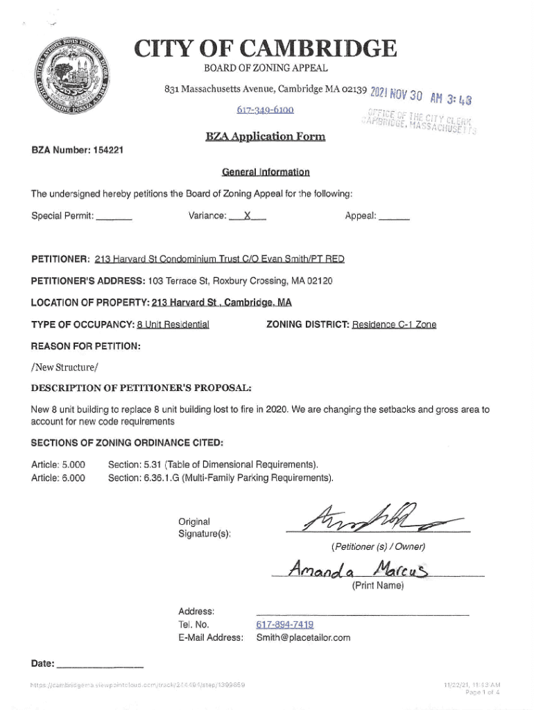 CITY OF CAMBRIDGE BOARD OF ZONING APPEAL831 Massachusetts Avenue, Cambridge MA 021392021 NOV3DQl7.::34.96100AM 3:43BZA Application Form BZA Number: 154221 General Information The undersigned hereby