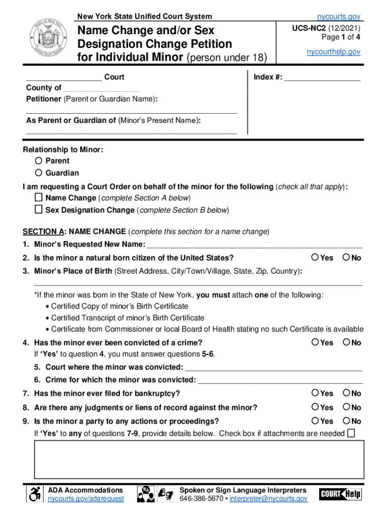 Reset Former York State United Court Systemize Change and/or Sex Designation Change Petition for Individual Minor (person under 18) ___ Court County of ___ Petitioner (Parent or Guardian Name): ___
