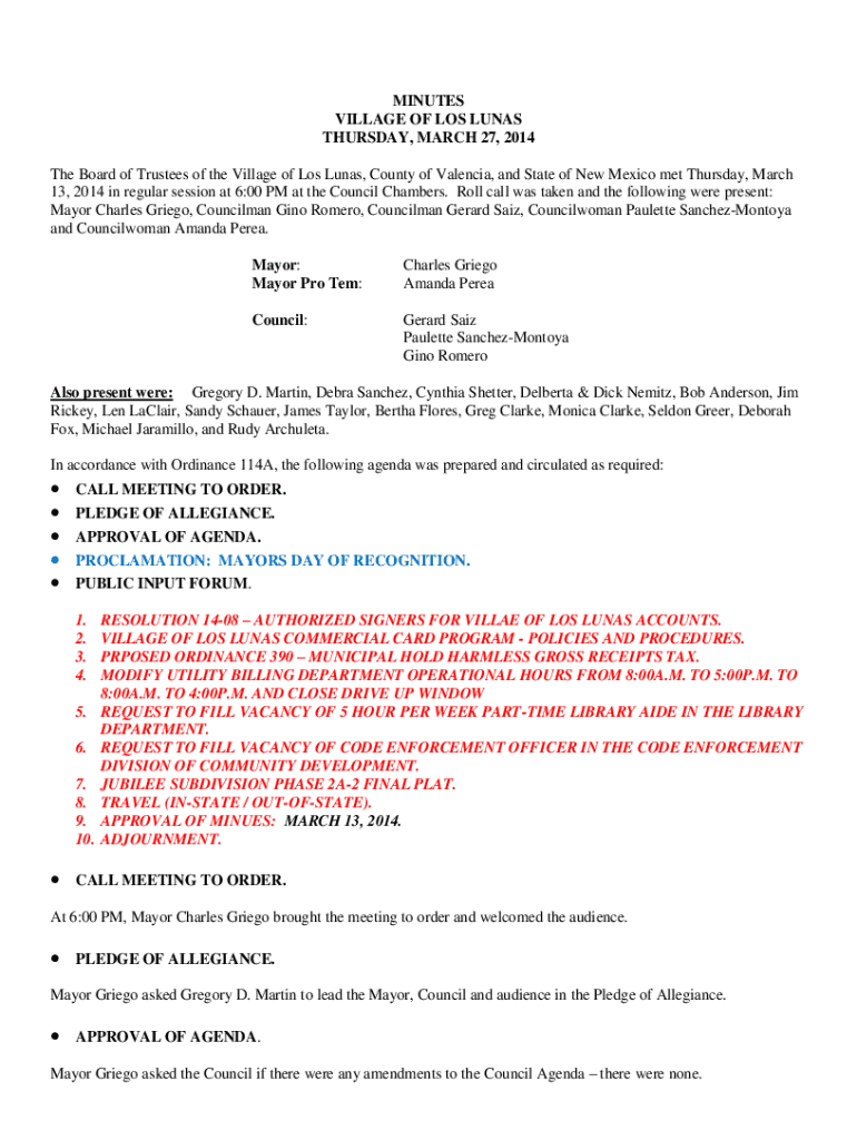 MINUTES VILLAGE OF LOS LUNAR THURSDAY, MARCH 27, 2014, The Board of Trustees of the Village of Los Luna's, County of Valencia, and State of New Mexico met Thursday, March 13, 2014, in regular session