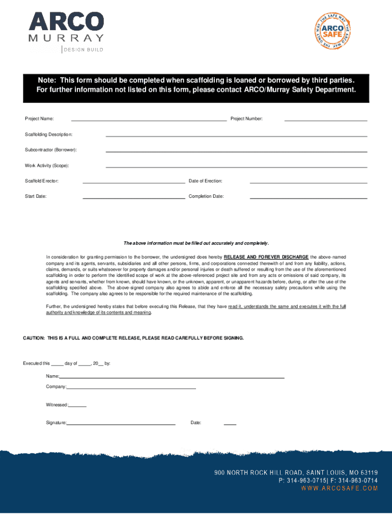 Note: This form should be completed when scaffolding is loaned or borrowed by third parties. For further information not listed on this form, please contact ARC/Murray Safety Department. Project Name:Project