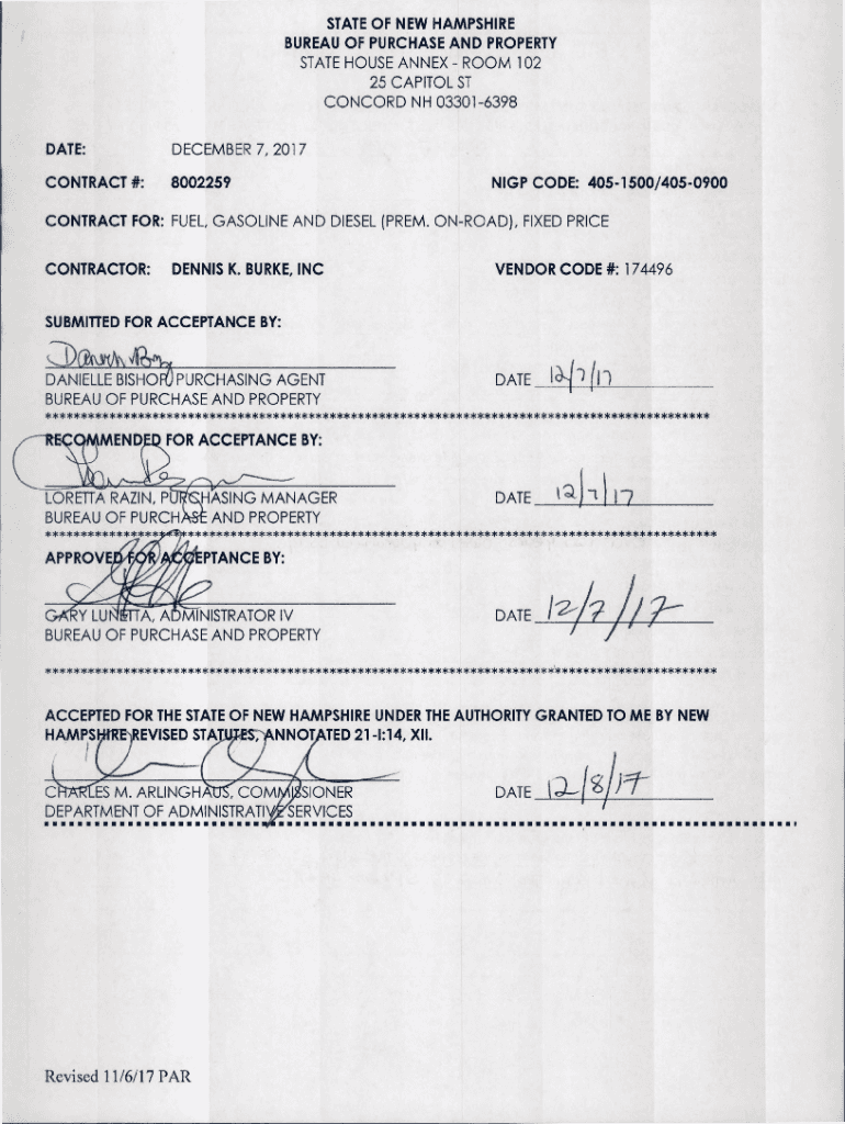 STATE OF NEW HAMPSHIRE BUREAU OF PURCHASE AND PROPERTY STATE HOUSE ANNEX ROOM 102 25 CAPITOL ST CONCORD NH 033016398 DATE:DECEMBER 7, 2017CONTRACT #: 8002259NIGP CODE: 405 1500/405 0900 CONTRACT FOR: