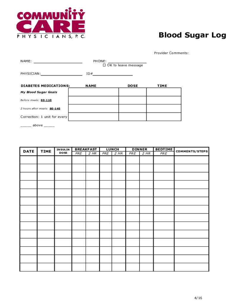 Blood Sugar Log Provider Comments: PHONE:NAME:OK to leave message PHYSICIAN:ID×DIABETES MEDICATIONS:NAMEDOSETIMEMy Blood Sugar Goals Before meals: 80110 2 hours after meals: 80140Correction: 1 unit