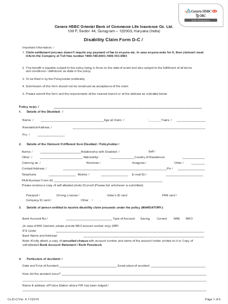 Canada HSBC Oriental Bank of Commerce Life Insurance Co. Ltd. 139 P, Sector 44, Guru gram 122003, Haryana (India)Disability Claim Form DC / Important Information: / 1. Claim settlement process doesn't\'t