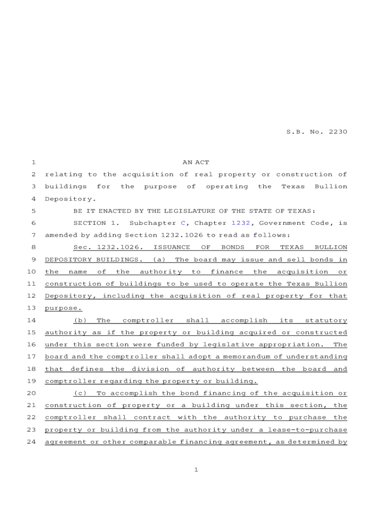 S.B.ANO. A22301AN ACT2relating to the acquisition of real property or construction of3buildings4Depository.forthepurposeofoperatingtheTexasBullion5BE IT ENACTED BY THE LEGISLATURE OF THE STATE OF