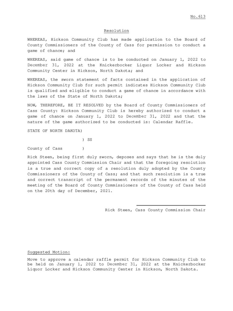 No.613 Resolution WHEREAS, Dickson Community Club has made application to the Board of County Commissioners of the County of Class for permission to conduct a game of chance; and WHEREAS, said game