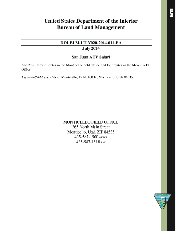 United States Department of the Interior Bureau of Land Management DOIBLMUTY0202014011EA July 2014 San Juan ATV Safari Location: Eleven routes in the Monticello Field Office and four routes in the