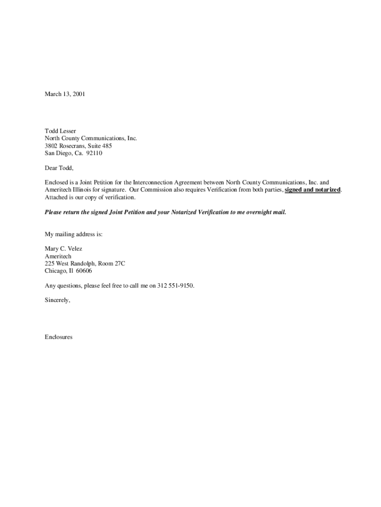 March 13, 2001Todd Lesser North County Communications, Inc. 3802 Rosecrans, Suite 485 San Diego, Ca. 92110 Dear Todd, Enclosed is a Joint Petition for the Interconnection Agreement between North County