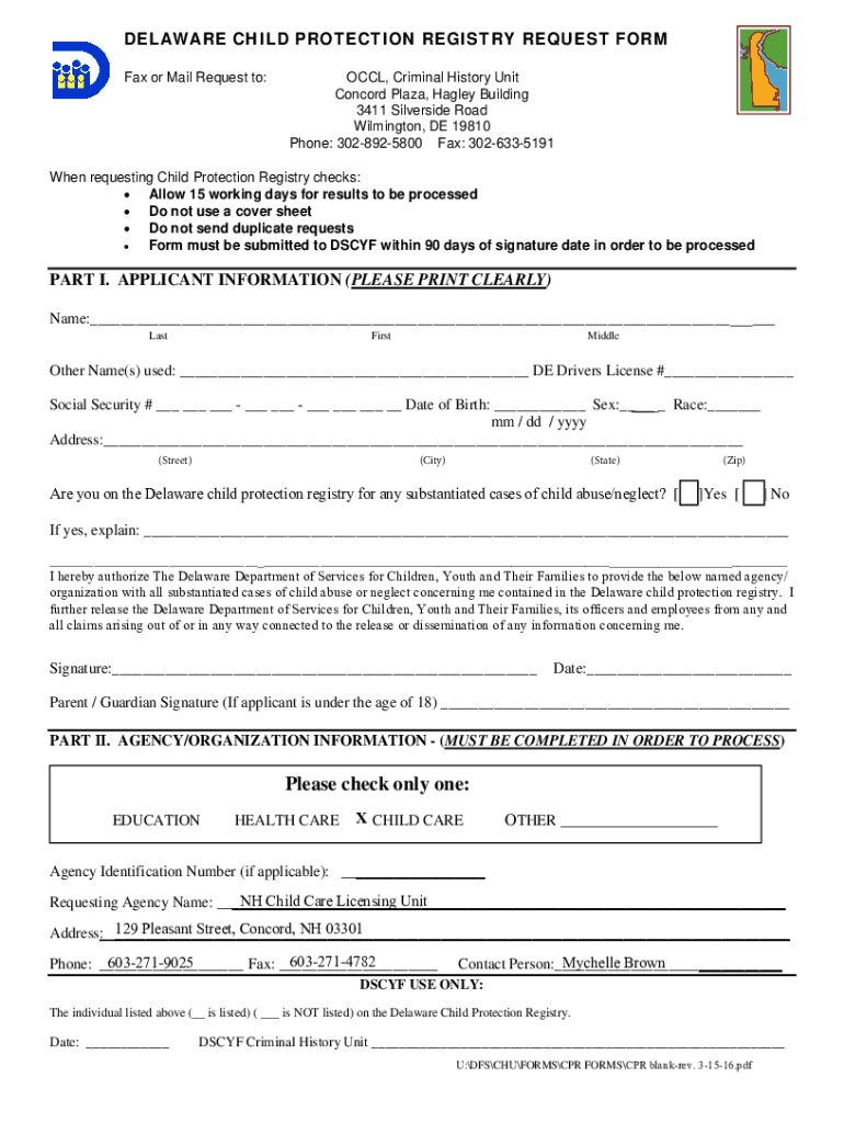 DELAWARE CHILD PROTECTION REGISTRY REQUEST FORM Fax or Mail Request to:ECCL, Criminal History Unit Concord Plaza, Harley Building 3411 Silverside Road Wilmington, DE 19810 Phone: 3028925800 Fax: 3026335191When