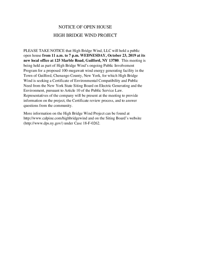 NOTICE OF OPEN HOUSE HIGH BRIDGE WIND PROJECT PLEASE TAKE NOTICE that High Bridge Wind, LLC will hold a public open house from 11 a.m. to 7 p.m. WEDNESDAY, October 23, 2019, at its new local office