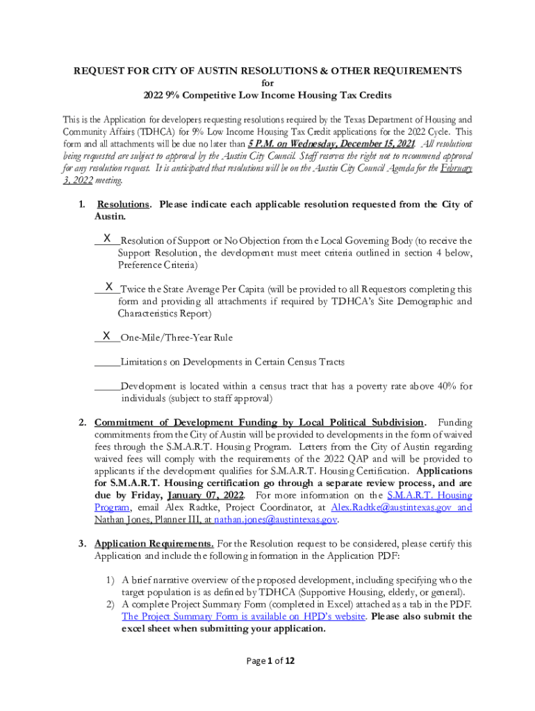 REQUEST FOR CITY OF AUSTIN RESOLUTIONS & OTHER REQUIREMENTS for 2022 9% Competitive Low Income Housing Tax Credits This is the Application for developers requesting resolutions required by the Texas