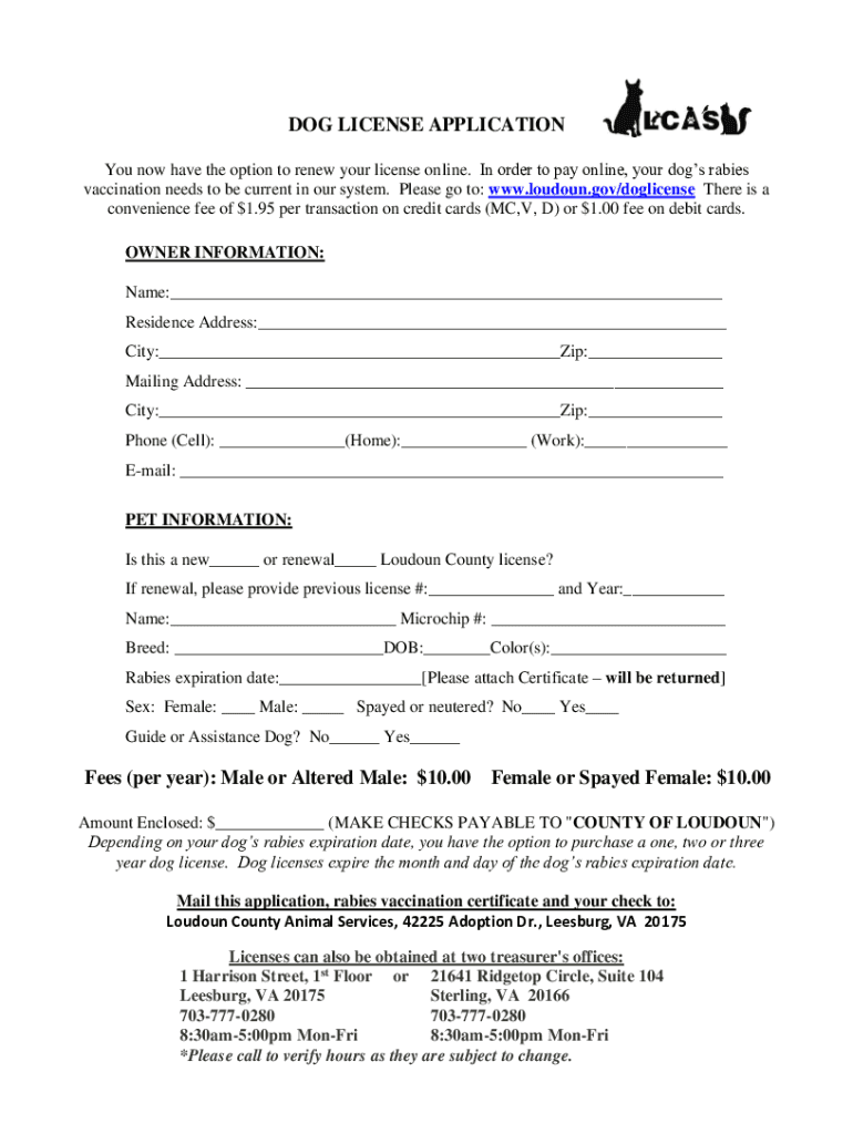 DOG LICENSE APPLICATION You now have the option to renew your license online. In order to pay online, your dogs rabies vaccination needs to be current in our system. Please go to: www.loudoun.gov/doglicense