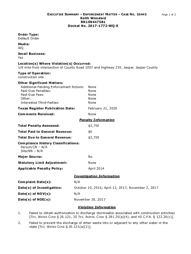 EXECUTIVE SUMMARY ENFORCEMENT MATTER CASE NO. 55445 Keith Woodard RN109447581 Docket No. 20171772WQEPage 1 of 2Order Type: Default Order Media: WE Small Business: Yes Location(s) Where Violation(s)