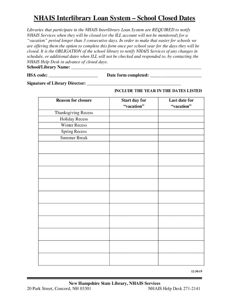 Get the free NHAIS Interlibrary Loan SystemSchool Closed Dates