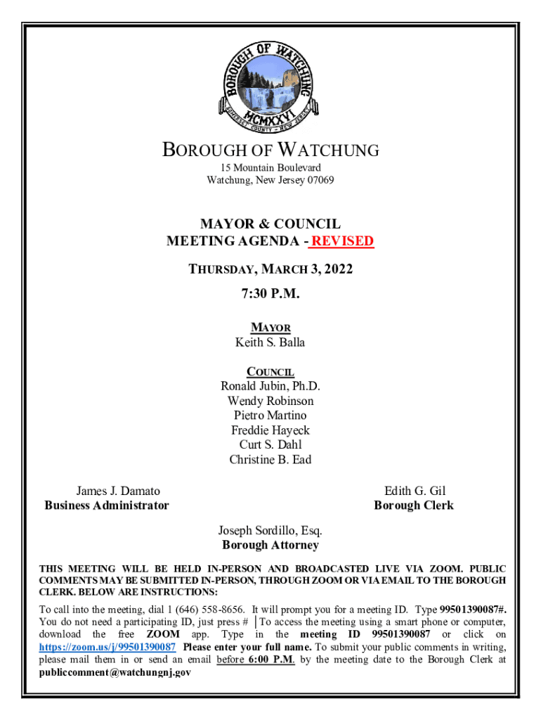 BOROUGH OF WATCHING 15 Mountain Boulevard Watching, New Jersey 07069MAYOR & COUNCIL MEETING AGENDA REVISED THURSDAY, MARCH 3, 2022 7:30 P.M. MAYOR Keith S. Ball COUNCIL Ronald Rubin, Ph.D. Wendy Robinson