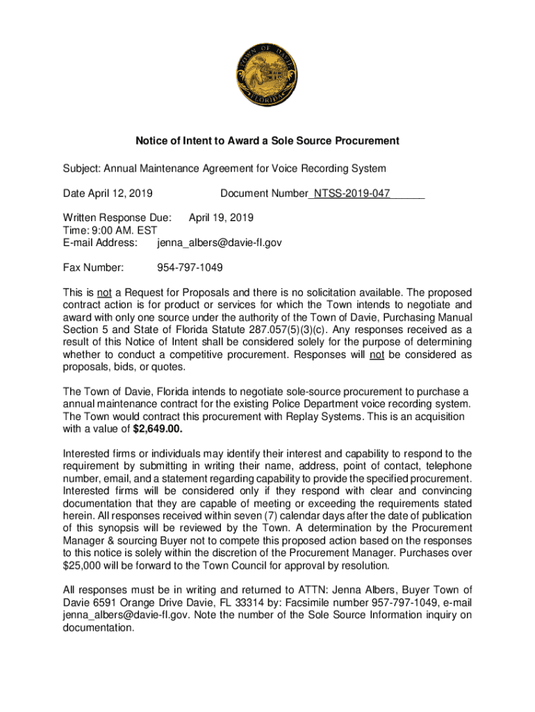 Get the free Notice of Intent to Award Sole Source Contractsdgs
