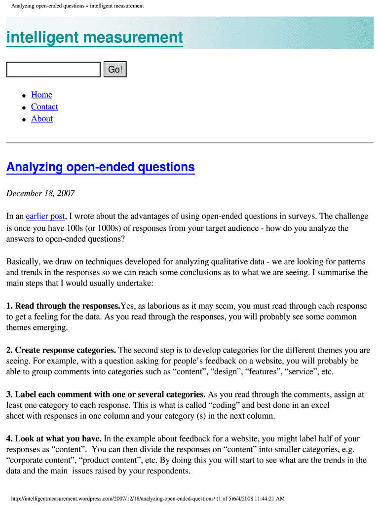 Analyzing open-ended questions intelligent measurement Go! Q q q Home Contact About Analyzing open-ended questions December 18, 2007, In an earlier post, I wrote about the advantages of using open-ended