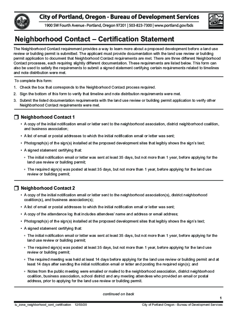 Neighborhood Contact Certification Statement The Neighborhood Contact requirement provides a way to learn more about a proposed development before a land use review or building permit is submitted.