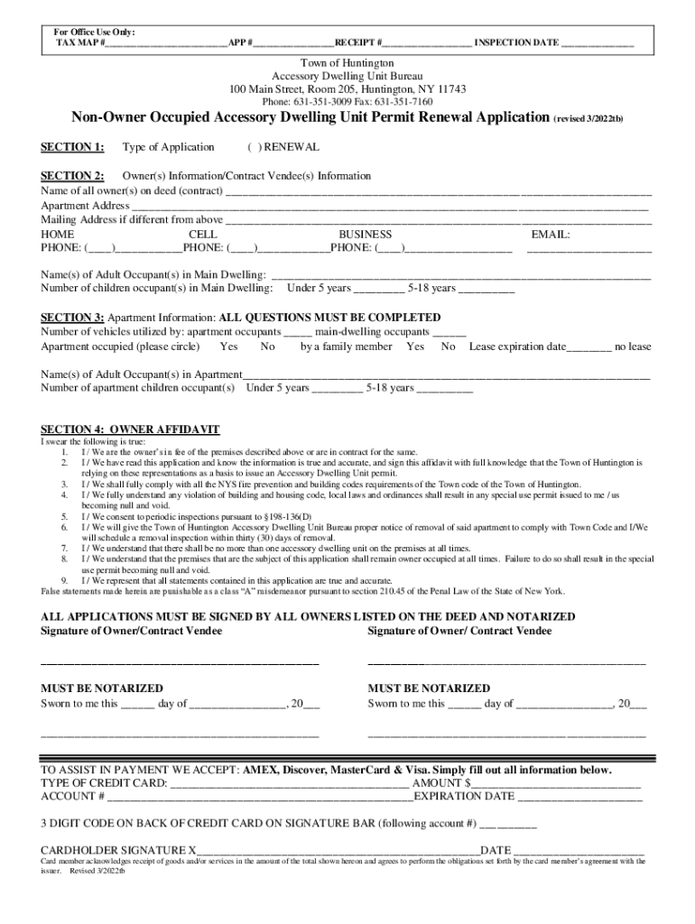 For Office Use Only: TAX MAP #___APP # ___RECEIPT #___ INSPECTION DATE ___Town of Huntington Accessory Dwelling Unit Bureau 100 Main Street, Room 205, Huntington, NY 11743 Phone: 6313513009 Fax: 6313517160NonOwner