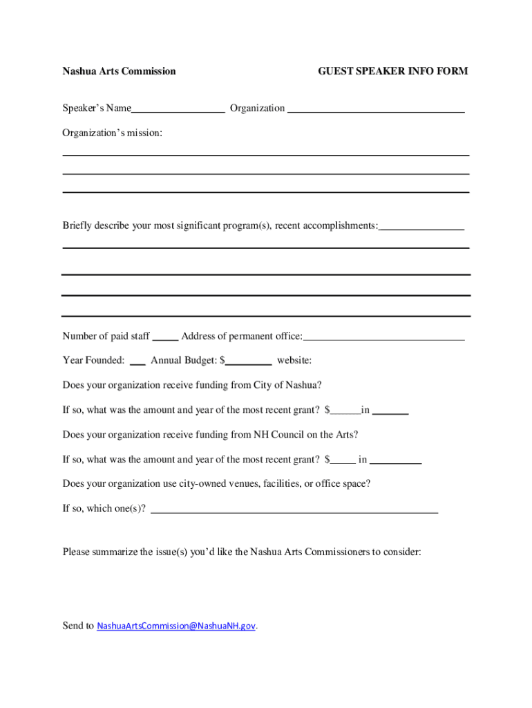 Nashua Arts CommissionGUEST SPEAKER INFO Loudspeakers Name___ Organization ___ Organizations mission: ___ ___ ___Briefly describe your most significant program(s), recent accomplishments: ___ ___Number