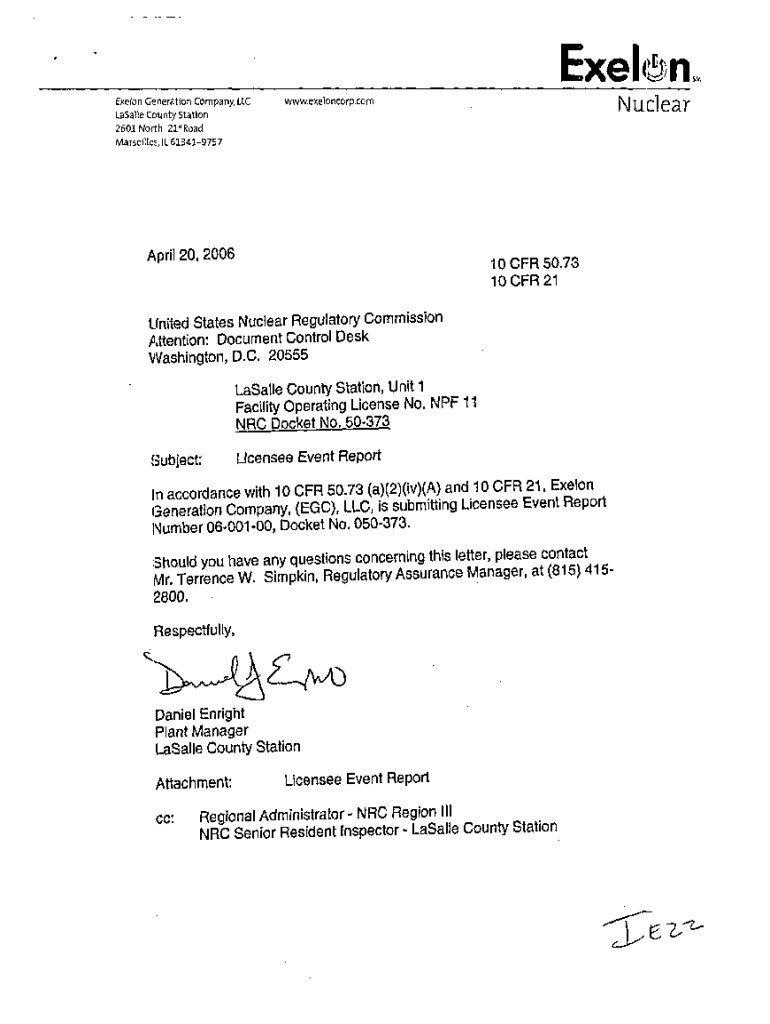 Generation Company, LLCExel4onsm Nuclear.exeloncorp.comparable County Station 2601 North 21\” Road Marseilles, IL613419757April 20, 200610 CFR 50.73 10 CFR 21United States Nuclear Regulatory Commission