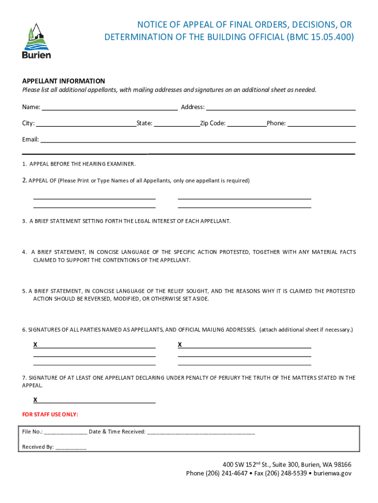 NOTICEOFAPPEALOFFINALORDERS, DECISIONS, OR DETERMINATIONOFTHEBUILDINGOFFICIAL(BMC15.05.400)APPELLANTINFORMATION Pleaselistalladditionalappellants, withmailingaddressesandsignaturesonanadditionalsheetasneeded.