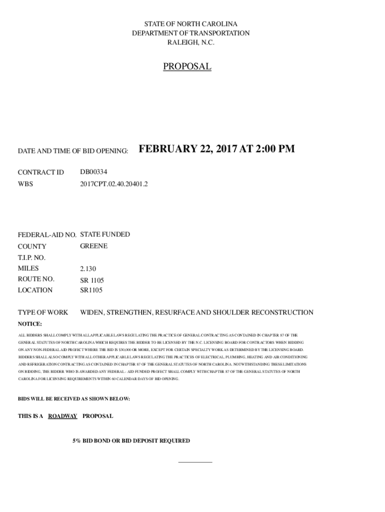 STATE OF NORTH CAROLINA DEPARTMENT OF TRANSPORTATION RALEIGH, N.C.PROPOSALDATE AND TIME OF BID OPENING:FEBRUARY 22, 2017, AT 2:00 CONTRACT IDDB00334WBS2017CPT.02.40.20401.2FEDERALAID NO. STATE FUNDED
